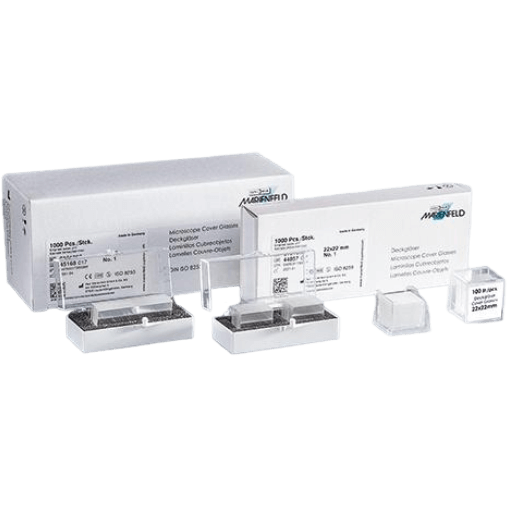 These is Superior cover glasses that feature excellent flatness and smooth surfaces thanks to the best material. No cover glasses made of soda lime glass match the quality of our borosilicate glass cover slips. Even when archived for years preparations keep their optical quality thanks to our noncorroding glass and the particularly low tolerance of the material thickness. Our precise machining processes make sure that our coverslips have the exact size and that their edges are cut with high precision. All of our efficient processes include stringent, integrated quality control and thus ensure high-quality coverslips which do not stick together.