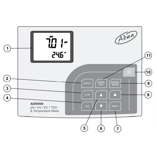 AD8000 is a microprocessor-based pH, ORP, conductivity, TDS, and temperature bench meter. A relative mV feature is also provided. The auto-ranging feature of the Conductivity and TDS ranges automatically sets the instrument to the scale with the highest resolution.