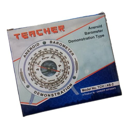 Aneroid Barometer, Model: TCH/AB-2 Demonstration Type is one kind of physics lab instruments. Made in India. Measuring Range: 660mmHg to 880mmHg. and 27 Inch Hg to 34 Inch Hg Analog Barometer. No electrical power is needed. Pump ball/bulb included. A Product by: Sandeep Automats. Product Size: 13cm x 12.5cm x 4.2cm, Materials: ABS Plastic.