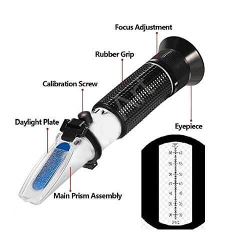 Professional Heavy Duty ATC 28-62% Brix Hand Held Refractometer for Ketchup, Jam, Jelly. A refractometer is an optical precision instrument that determines the density of a liquid by the index of refraction.
