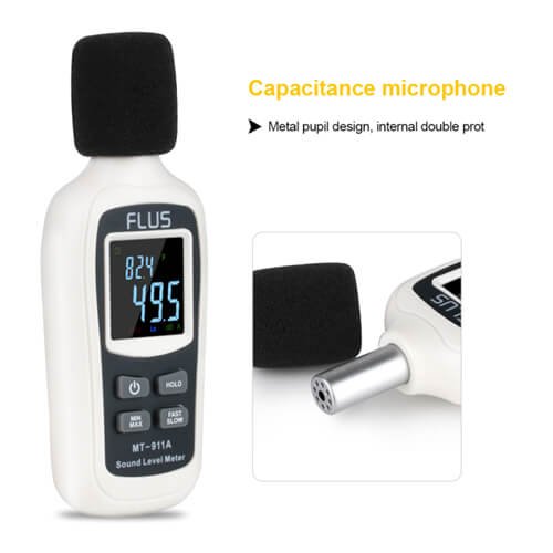 Flus Digital Mini Sound Level Meter MT-911A with Temperature Meter. This unit utilizes a condenser microphone as the sensor, a high-end MCU for calculation, and features high accuracy and fast response. This Sound Level Meter is designed to meet the measurement requirements of safety Engineers, Health, and Industrial safety offices. And sound quality control in various environments, such as factories, schools, and construction sites etc.