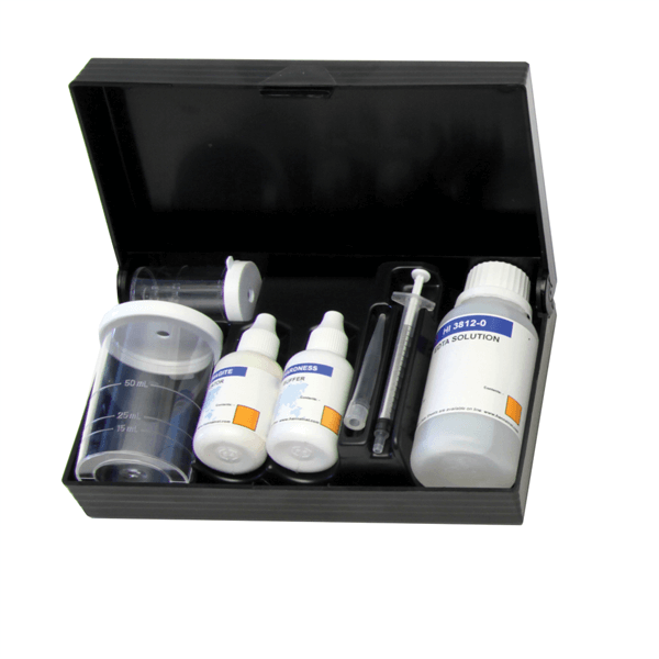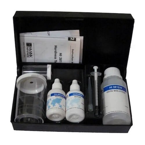 Hanna Total Water Hardness Test Kit HI3812 is Made in Romania and 100 Test Per Box is a titration-based chemical test kit. It determines the total hardness concentration in two ranges: 0.0 to 30.0 mg/L and 0 to 300 mg/L. The HI3812 is supplied with all of the necessary reagents and equipment to perform the analysis.