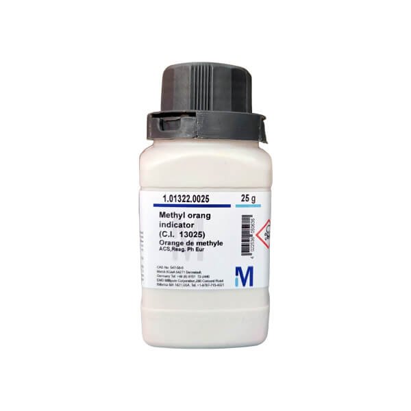 Methyl Orange Indicator (25g, Merck) is a commonly used pH indicator in titrations, particularly for determining the acidity or alkalinity of a solution. It changes color depending on the pH of the solution: