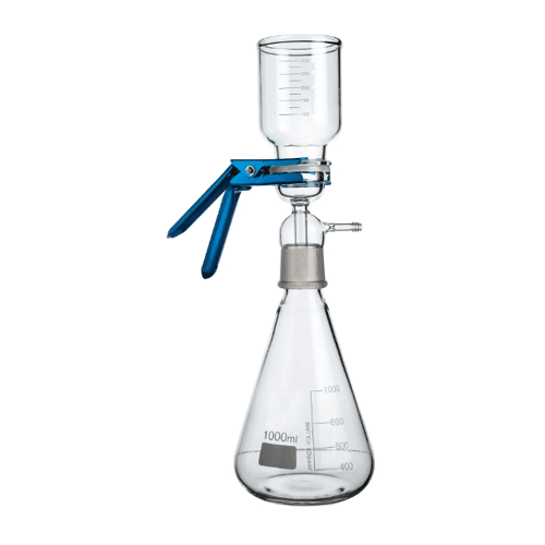 This Filtration Unit 1000ml consists of a 300ml upper filter cup, one joined clamp, and a 1000ml filtration Flask. This is a membrane filter with a 47mm diameter, made of borosilicate type Clear glass.