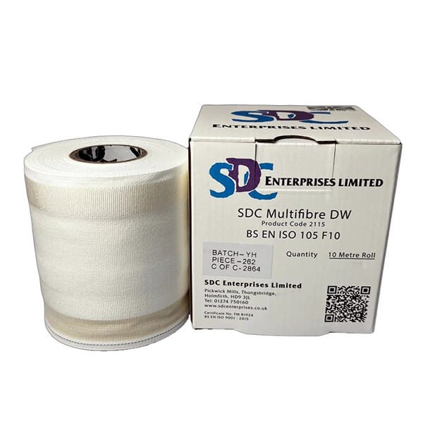The textile uses Multifibre DW SDC Product Codes: 2115: 10 meters Roll per box. Developed by the Society of Dyers & Colourists in 1986 SDC Multifibre DW is a testing fabric comprising six different fiber components. SDC Multifibre can be used as an adjacent fabric in many of the ISO 105 C Series and E Series of Colour fastness tests and meets chain store fastness test specifications.