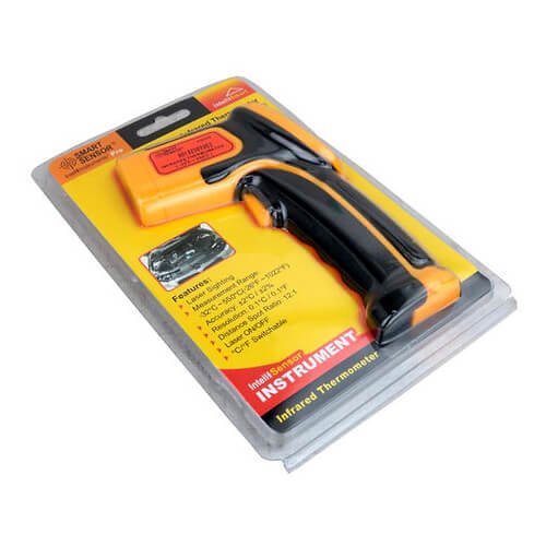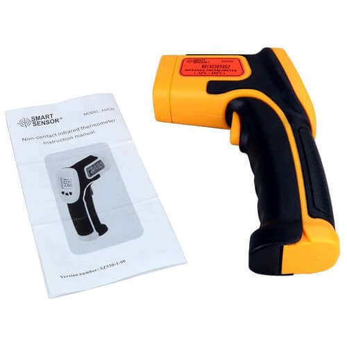Smart Sensor Digital Infrared Thermometer AS530 is a Non-Contact Laser Gun and its measuring range is -32°~550°C (-26~1022F). The most basic design consists of a lens to focus the infrared (IR) energy onto a detector, which converts the energy to an electrical signal that can be displayed in units of temperature after being compensated for ambient temperature variation.
