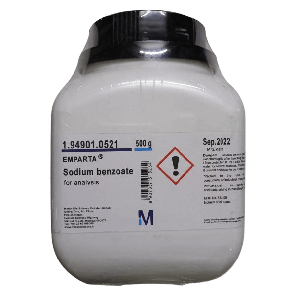 Sodium Benzoate from Merck India is a high-purity, crystalline powder with the chemical formula C₇H₅NaO₂. This versatile compound is widely used as a food preservative, antimicrobial agent, and in various industrial applications. Packaged in a convenient 500 g size, it is suitable for laboratories, food production, and pharmaceutical use.