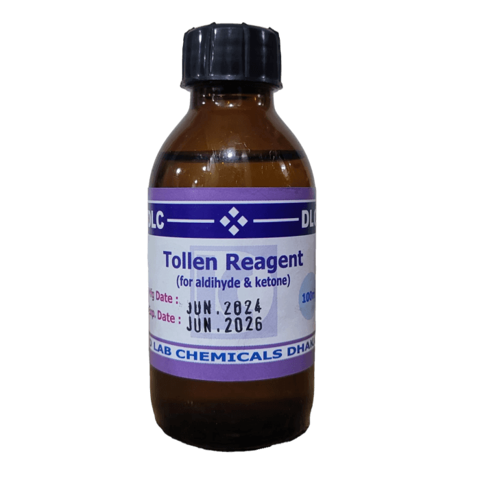 Tollens’ reagent is prepared by adding ammonia (NH₃) to a dilute solution of silver nitrate (AgNO₃). The reaction between ammonia and silver nitrate results in the formation of a colorless complex ion, [Ag(NH₃)₂]⁺, which is soluble in water:Reactions of Tollen Reagent 100mL for Aldihyde and Ketone