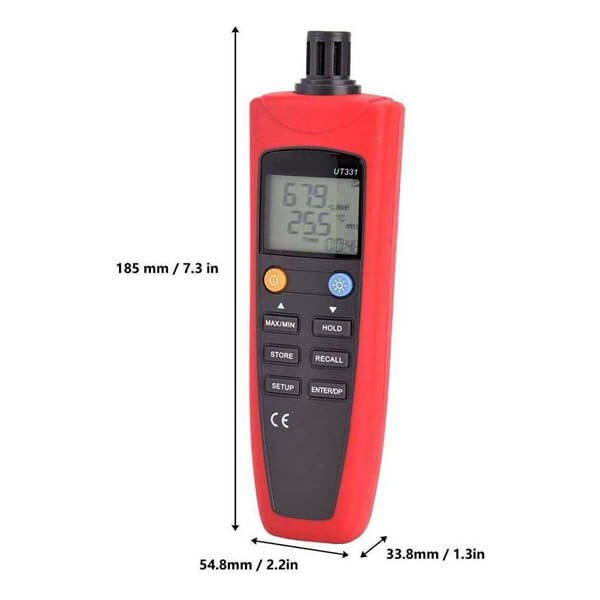 UT331+ Temperature Humidity Meter measures temperature and humidity with low power consumption and high precision. The measured data can be saved and exported to PC software for further analysis. These meters can be used in factories, food, health, environmental protection, and other fields.