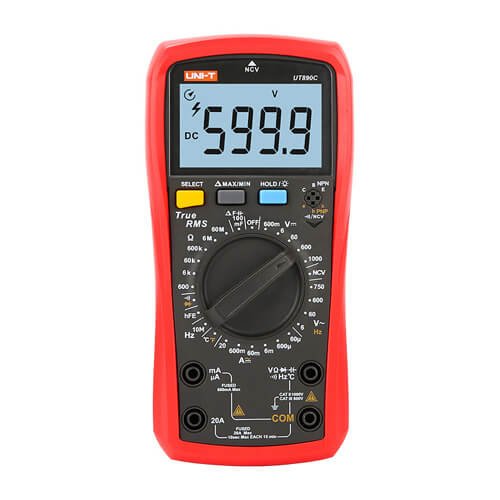 UNI-T UT890C RMS Multimeter With Temperature Tester. The UT890 series 6000-count true RMS digital multimeters are designed with a large LCD. The maximum measurable capacitance is 100mF, with a fast response time of less than 12s. The NCV and continuity measurement have acousto-optic indications. UT890C or UT890D+ has a LIVE function for distinguishing between live and neutral wires. In addition, it is equipped with automatic fuse blown detection and high voltage protection. Models in UT890 Series: UT890C, UT890D+